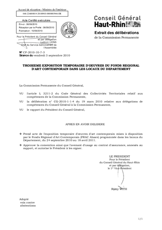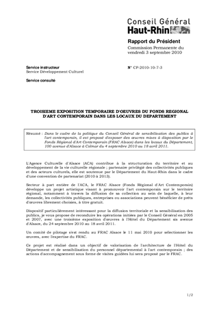 Dans le cadre de la politique du Conseil Général de sensibilisation des publics à l'art contemporain, il est proposé d'exposer des œuvres mises à disposition par le Fonds Régional d'Art Contemporain (FRAC Alsace) dans les locaux du Département, 100 avenue d'Alsace à Colmar du 24 septembre 2010 au 18 avril 2011.