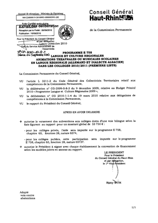 PROGRAMME E 758LANGUE ET CULTURE REGIONALESANIMATIONS THEATRALES OU MUSICALES SCOLAIRES EN LANGUE REGIONALE (ALLEMAND ET DIALECTE ALSACIEN)DANS LES COLLEGES 2010/2011(PREMIERE LISTE)