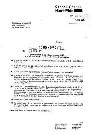 portant fixation du prix de journée 2005 de la maison d'enfants "Home St Jean" à MULHOUSE. Resumé Pièces jointes ARRETE Assemblée : Non défini Date : 29/06/2005 Rapporteur : Non défini Collectivité : Conseil départemental du Haut-Rhin Direction : Non défini Service : Service de la Tarification des Etablissements Domaine : Prix de Journée Commission :