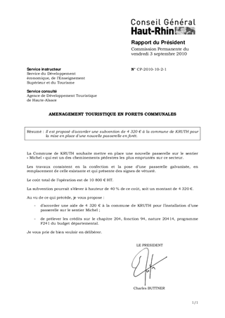 Il est proposé d'accorder une subvention de 4 320 € à la commune de KRUTH pour la mise en place d'une nouvelle passerelle en forêt.
