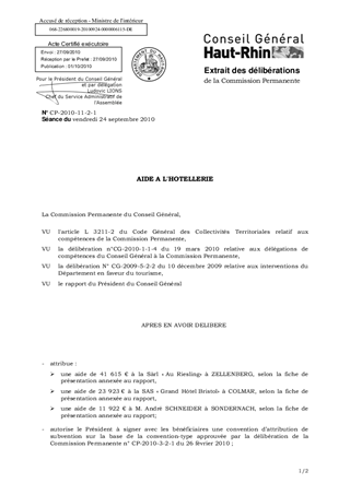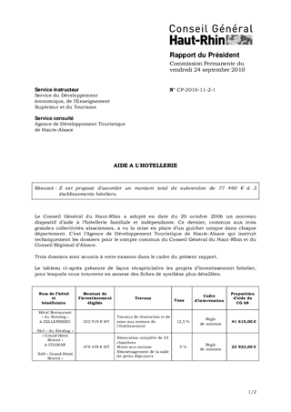 AIDE A L'HOTELLERIE Resumé Il est proposé d'accorder un montant total de subvention de 77 460 € à 3 établissements hôteliers. Pièces jointes DELIBERATION RAPPORT Assemblée : Commission Permanente Date : 24/09/2010 Rapporteur : Non défini Collectivité : Conseil départemental du Haut-Rhin Direction : Non défini Service : Service Développement Economique Domaine : Tourisme Commission : Commission Permanente