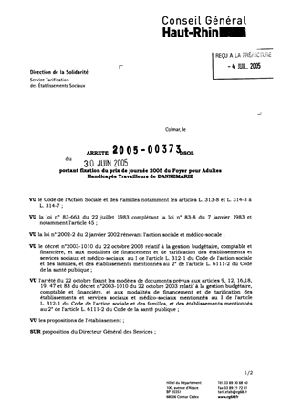 portant fixation du prix de journée 2005 du foyer pour adultes handicapés travailleurs de DANNEMARIE. Resumé Pièces jointes ARRETE Assemblée : Non défini Date : 30/06/2005 Rapporteur : Non défini Collectivité : Conseil départemental du Haut-Rhin Direction : Non défini Service : Service de la Tarification des Etablissements Domaine : Prix de Journée Commission :