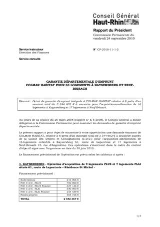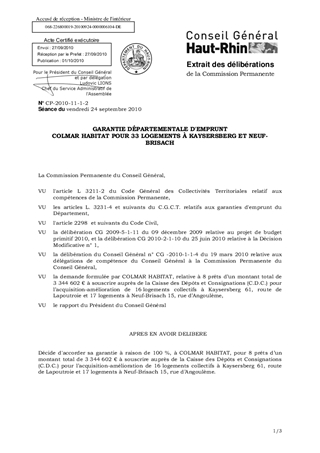 GARANTIE DÉPARTEMENTALE D'EMPRUNT COLMAR HABITAT POUR 33 LOGEMENTS À KAYSERSBERG ET NEUF-BRISACH