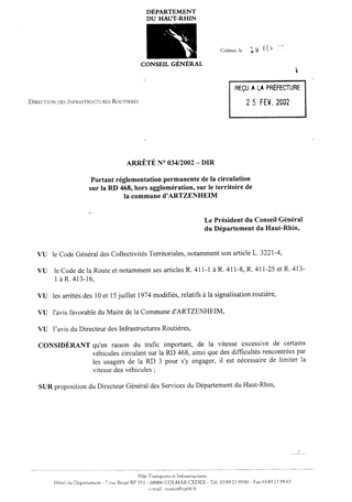 Portant réglementation permanente de la circulation sur la RD 468, hors agglomération, sur le territoire de la commune d'ARTZENHEIM Resumé Pièces jointes ARRETE Assemblée : Non défini Date : 19/02/2002 Rapporteur : Non défini Collectivité : Conseil départemental du Haut-Rhin Direction : Non défini Service : Direction des Routes Domaine : Circulation Commission :