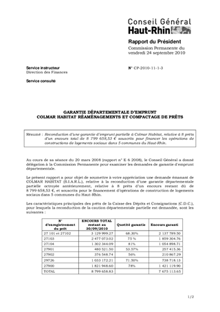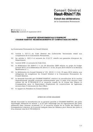 GARANTIE DÉPARTEMENTALE D'EMPRUNT COLMAR HABITAT RÉAMÉNAGEMENTS ET COMPACTAGE DE PRÊTS