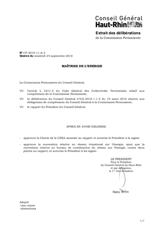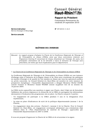 Le rapport propose d’adopter la Charte de la Conférence Régionale de l’Energie et de l’Atmosphère en Alsace (CREA), ainsi que deux conventions relatives au Programme Interreg IV concernant le réseau trinational sur l’énergie. En outre, les principales orientations de la loi Grenelle 2 dans le domaine de l’énergie sont présentées, de même que leurs implications pour le département.