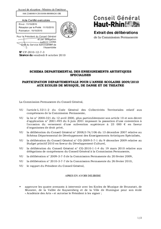 Dans le cadre de la mise en œuvre du Schéma Départemental des Enseignements Artistiques, il est proposé : - de valider quatre avenants à des conventions annuelles d'exécution intervenues avec les Ecoles centre de Brunstatt, de Munster, de la Vallée de Kaysersberg et de la Ville de Huningue pour le fonctionnement de leur école en 2010 et d’autoriser le Président à les signer ; - d'autoriser le versement de la participation du Conseil Général aux écoles de Musique, de Danse et de Théâtre ayant adhéré au Schéma Départemental pour un montant total de 162 880 €.