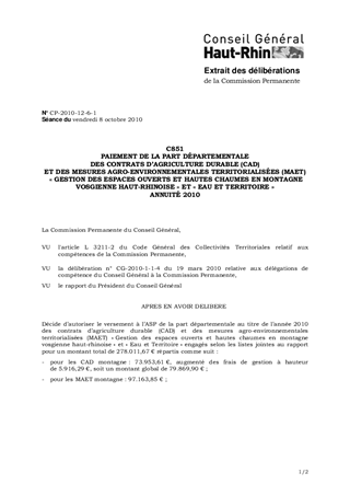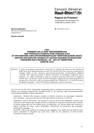 C851 PAIEMENT DE LA PART DÉPARTEMENTALE DES CONTRATS D’AGRICULTURE DURABLE (CAD) ET DES MESURES AGRO-ENVIRONNEMENTALES TERRITORIALISÉES (MAET) « GESTION DES ESPACES OUVERTS ET HAUTES CHAUMES EN MONTAGNE VOSGIENNE HAUT-RHINOISE » ET « EAU ET TERRITOIRE » ANNUITÉ 2010