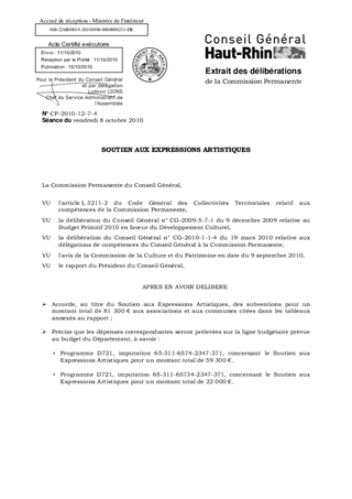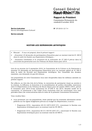 Il vous est proposé, dans le présent rapport : - d'examiner 23 demandes de participations financières pour un montant total de 81 300 € dans le cadre du Soutien aux Expressions Artistiques ; - d'autoriser l'attribution et le versement de la subvention de 27 000 € prévue dans la convention de partenariat avec les Tréteaux de Haute-Alsace pour 2010.