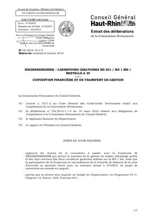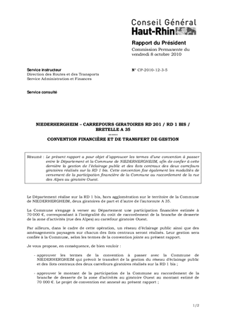 NIEDERHERGHEIM – CARREFOURS GIRATOIRES RD 201 / RD 1 BIS / BRETELLE A 35 ------ CONVENTION FINANCIÈRE ET DE TRANSFERT DE GESTION