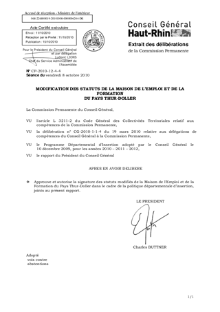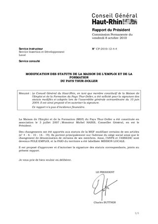 Le Conseil Général du Haut-Rhin, en tant que membre constitutif de la Maison de l’Emploi et de la Formation du Pays Thur-Doller, a été sollicité pour la signature des statuts modifiés et adoptés lors de l’assemblée générale extraordinaire du 10 juin 2009. Il est ainsi proposé d’en autoriser la signature. Ce rapport n’a pas d’incidence financière.