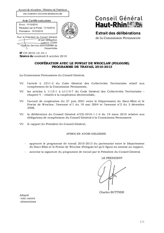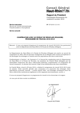 Il vous est proposé d'approuver le programme de travail 2010-2013 du partenariat entre le Département du Haut-Rhin et le Powiat de Wroclaw (Pologne).