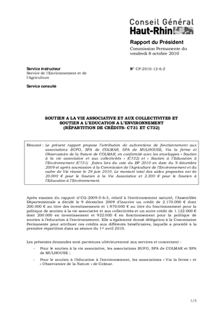 Le présent rapport propose l’attribution de subventions de fonctionnement aux associations BUFO, SPA de COLMAR, SPA de MULHOUSE, Via la ferme et Observatoire de la Nature de COLMAR, en conformité avec les enveloppes « Soutien à la vie associative et aux collectivités » (C732) et « Soutien à l’Education à l’Environnement (C731) fixées lors du vote du BP 2010 en date du 9 décembre 2009 et après soumission à la Commission de l'Agriculture de l'Environnement et du cadre de Vie réunie le 29 juin 2010. Le montant total des aides proposées est de 20.000 € pour le Soutien à la Vie Associative et 2.300 € pour le Soutien à l’Education à l’Environnement.