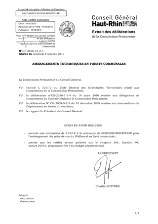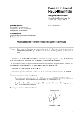 Il est proposé d'accorder une subvention de 3 244 € en faveur de la commune de NIEDERMORSCHWIHR qui réalise des travaux d'aménagements touristiques en forêt.
