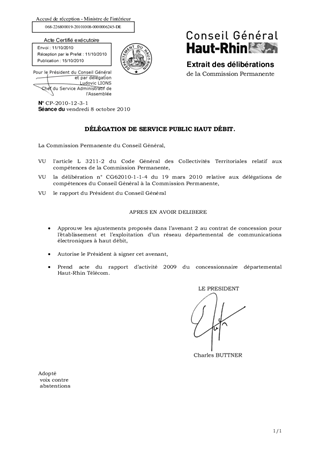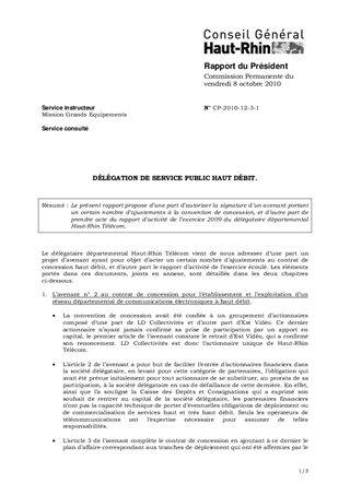 Le présent rapport propose d’une part d’autoriser la signature d’un avenant portant un certain nombre d’ajustements à la convention de concession, et d’autre part de prendre acte du rapport d’activité de l’exercice 2009 du délégataire départemental Haut-Rhin Télécom.