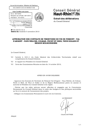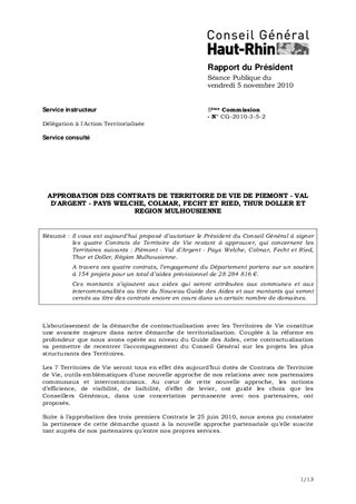APPROBATION DES CONTRATS DE TERRITOIRE DE VIE DE PIEMONT - VAL D'ARGENT - PAYS WELCHE, COLMAR, FECHT ET RIED, THUR DOLLER ET REGION MULHOUSIENNE