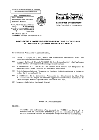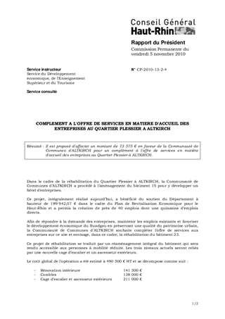 Il est proposé d'affecter un montant de 73 575 € en faveur de la Communauté de Communes d'ALTKIRCH pour un complément à l'offre de services en matière d'accueil des entreprises au Quartier Plessier à ALTKIRCH.