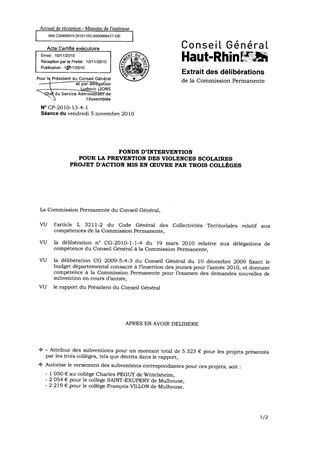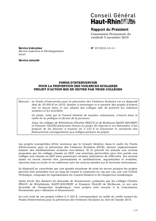 Le Fonds d'Intervention pour la prévention des Violences Scolaires est un dispositif doté de 30 000 € en 2010, destiné à encourager et à soutenir des projets d'actions mis en œuvre dans et aux abords des collèges afin de prévenir les violences scolaires et les incivilités. Ce fonds, initié par le Conseil Général de manière volontariste, s’inscrit dans le cadre de sa politique en faveur de la jeunesse. Ainsi, les collèges de Wittelsheim (Charles PEGUY) et de Mulhouse (SAINT-EXUPERY et François VILLON) présentent chacun un projet. En réponse à ces demandes, il est proposé de les financer à hauteur de 5 323 € et d'autoriser le versement des financements correspondants aux collèges porteurs de projets