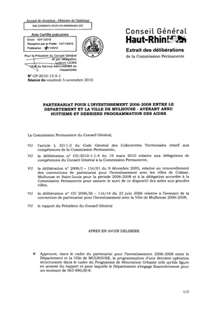 PARTENARIAT POUR L'INVESTISSEMENT 2006-2008 ENTRE LE DEPARTEMENT ET LA VILLE DE MULHOUSE - AVENANT ANRUHUITIEME ET DERNIERE PROGRAMMATION DES AIDES