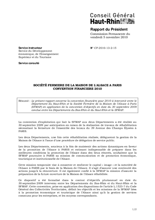 Le présent rapport concerne la convention financière pour 2010 à intervenir entre le Département du Haut-Rhin et la Société Fermière de la Maison de l'Alsace à Paris (SFMAP) en application de la convention d'objectifs en date du 30 septembre 2009 conclue entre les Départements du Bas-Rhin et du Haut-Rhin et la SFMAP.