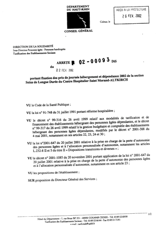 Portant fixation des prix de journée hébergement et dépendance 2002 de la section soins de longue durée du centre hospitalier Saint Morand à Altkirch Resumé Pièces jointes ARRETE Assemblée : Non défini Date : 22/02/2002 Rapporteur : Non défini Collectivité : Conseil départemental du Haut-Rhin Direction : Non défini Service : Service de la Tarification des Etablissements Domaine : Prix de Journée Commission :