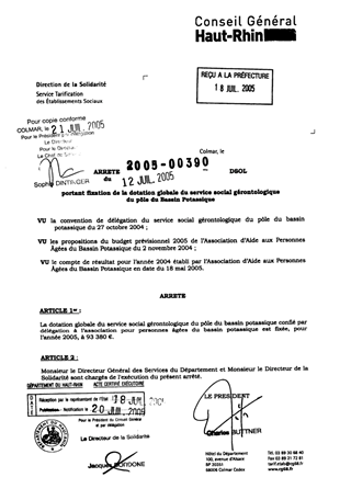 portant fixation de la dotation globale du service social gérontologique du pôle du Bassin Potassique. Resumé Pièces jointes ARRETE Assemblée : Non défini Date : 12/07/2005 Rapporteur : Non défini Collectivité : Conseil départemental du Haut-Rhin Direction : Non défini Service : Service de la Tarification des Etablissements Domaine : Dotations financières Commission :