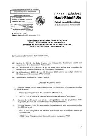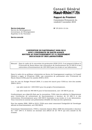 CONVENTION DE PARTENARIAT 2008/2010 AVEC L'UNIVERSITE DE HAUTE-ALSACESOUTIEN AU FONCTIONNEMENT ET À L'EQUIPEMENT DES ECOLES ET DES LABORATOIRES