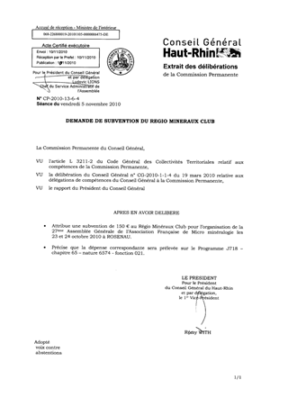 Il vous est proposé d’accorder une subvention de 150 € au Régio Minéraux Club pour l’organisation de la 27ème Assemblée Générale de l’Association Française de Micro minéralogie à prélever sur le Fonds départemental pour la participation à des congrès ou manifestations à caractère national ou international se déroulant dans le Haut Rhin.