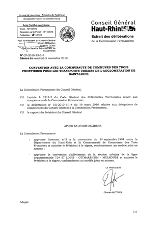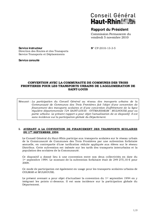 La participation du Conseil Général au réseau des transports urbains de la Communauté de Communes des Trois Frontières fait l'objet d'une convention de financement des transports scolaires et d'une convention d'affrètement de la ligne régulière départementale 724 SAINT-LOUIS - OTTMARSHEIM - MULHOUSE pour sa partie urbaine. Le présent rapport a pour objet l'actualisation de ce dispositif. Il est sans incidence sur la participation globale du Département.