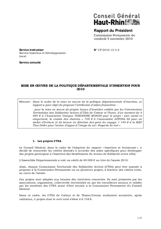 Dans le cadre de la mise en oeuvre de la politique départementale d’insertion, ce rapport a pour objet de proposer l’attribution d’aides financières : - pour la mise en œuvre de projets locaux d’insertion validés par les Commissions Territoriales des Solidarités Actives (CTSA) de Colmar et Thann, d’un montant de 4 889 € à l’Association Campus THEODORE MONOD pour le projet « Lien social et citoyenneté, la croisée des chemins », 709 € à l’association APPONA 68 pour un atelier d’écriture et de lecture en direction des gens du voyage, 1 140 € à la MEF Thur-Doller pour l’action d’appui à l’image de soi « Regards de moi ».