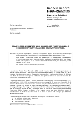 Le présent rapport vous propose d’adopter les Projets Pour l’Insertion élaborés par chacune des huit Commissions Territoriales des Solidarités Actives (CTSA). Ces projets, s’inscrivant dans les orientations du Programme Départemental d’Insertion, proposent un bilan de l’action réalisée entre 2006 et 2008 par chaque CTSA, un diagnostic de la situation de son territoire et un plan d’actions pour la période 2010 – 2012. Ce rapport n’a aucune incidence financière.