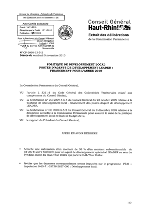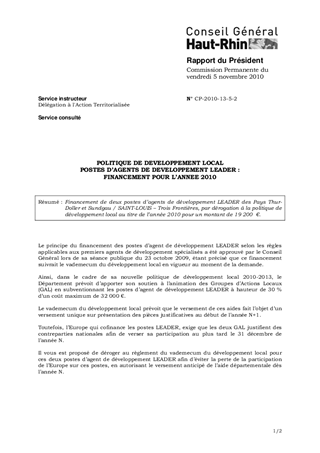 POLITIQUE DE DEVELOPPEMENT LOCALPOSTES D’AGENTS DE DEVELOPPEMENT LEADER : FINANCEMENT POUR L’ANNEE 2010