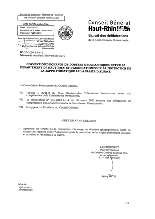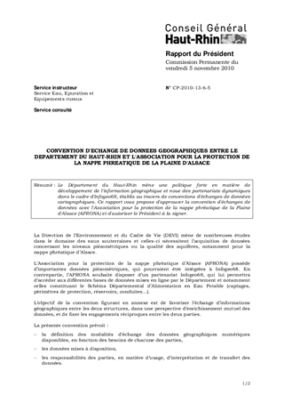CONVENTION D'ECHANGE DE DONNEES GEOGRAPHIQUES ENTRE LE DEPARTEMENT DU HAUT-RHIN ET L'ASSOCIATION POUR LA PROTECTION DE LA NAPPE PHREATIQUE DE LA PLAINE D'ALSACE