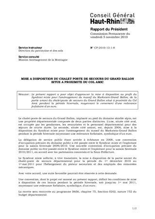Le présent rapport a pour objet d'approuver la mise à disposition au profit du Syndicat mixte pour l'aménagement du massif du Markstein-Grand Ballon, de la partie amont du chalet-poste de secours du Grand Ballon situé à proximité du Col Amic pendant la période hivernale, moyennant le versement d'une redevance forfaitaire d'un euro.
