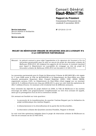 Le présent avenant a pour objet l'approbation et la signature de l'avenant n°6 à la convention partenariale pour la mise en oeuvre du projet de rénovation urbaine de Mulhouse 2006-2012. En intégrant les apports de cet avenant, le montant maximal pour lequel le Département est susceptible de s'engager au titre du projet de rénovation urbaine de Mulhouse 2006-2012 est réevalué à 12 826 215 €.