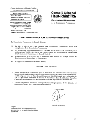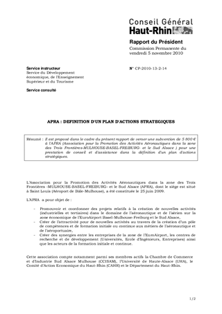 Il est proposé dans le cadre du présent rapport de verser une subvention de 5 800 € à l'APRA (Association pour la Promotion des Activités Aéronautiques dans la zone des Trois Frontières-MULHOUSE-BASEL-FREIBURG- et le Sud Alsace ) pour une prestation de conseil et d'assistance dans la définition d'un plan d'actions stratégiques.