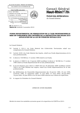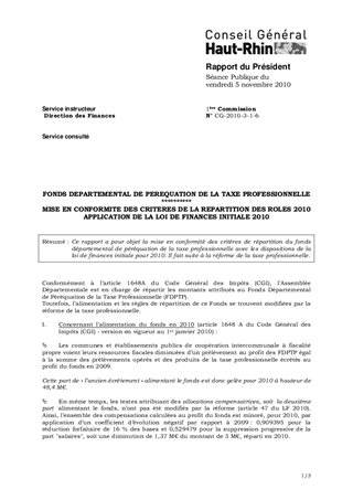Ce rapport a pour objet la mise en conformité des critères de répartition du fonds départemental de péréquation de la taxe professionnelle avec les dispositions de la loi de finances initiale pour 2010. Il fait suite à la réforme de la taxe professionnelle.