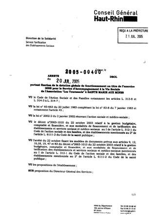 portant fixation de la dotation globale de fonctionnement au titre de l'exercice 2005 pour le service d'accompagnement à la vie sociale de l'association "Les Tournesols" à SAINTE MARIE AUX MINES. Resumé Pièces jointes ARRETE Assemblée : Non défini Date : 20/07/2005 Rapporteur : Non défini Collectivité : Conseil départemental du Haut-Rhin Direction : Non défini Service : Service de la Tarification des Etablissements Domaine : Dotations financières Commission :