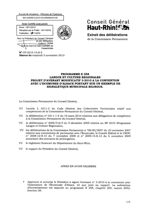 PROGRAMME E 258LANGUE ET CULTURE REGIONALESPROJET D’AVENANT MODIFICATIF 3-2010 A LA CONVENTION AVEC L’ECOMUSEE D’ALSACE PORTANT SUR UN EXEMPLE DE SIGNALETIQUE MUNICIPALE BILINGUE.