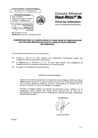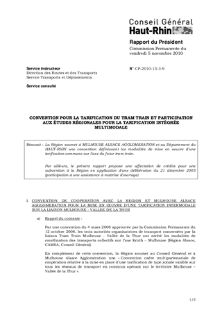 La Région soumet à MULHOUSE ALSACE AGGLOMERATION et au Département du HAUT-RHIN une convention définissant les modalités de mise en oeuvre d'une tarification commune sur l'axe du futur tram-train. Par ailleurs, le présent rapport propose une affectation de crédits pour une subvention à la Région en application d'une délibération du 21 décembre 2005 (participation à une assistance à maîtrise d'ouvrage)