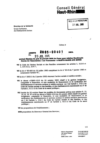 portant fixation des prix de journée 2005 du foyer pour adultes handicapés graves à l'association "Les Tournesols" à SAINTE MARIE AUX MINES. Resumé Pièces jointes ARRETE Assemblée : Non défini Date : 20/07/2005 Rapporteur : Non défini Collectivité : Conseil départemental du Haut-Rhin Direction : Non défini Service : Service de la Tarification des Etablissements Domaine : Prix de Journée Commission :