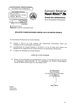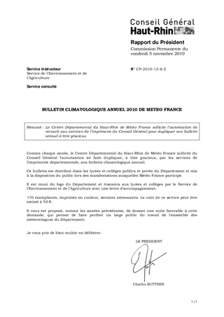 Le Centre Départemental du Haut-Rhin de Météo France sollicite l’autorisation de recourir aux services de l’imprimerie du Conseil Général pour dupliquer son bulletin annuel à titre gracieux.