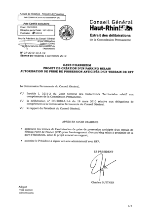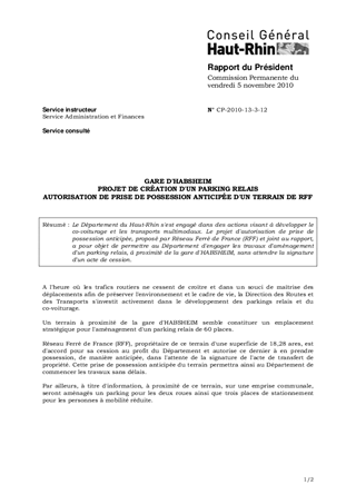 Le Département du Haut-Rhin s'est engagé dans des actions visant à développer le co-voiturage et les transports multimodaux. Le projet d'autorisation de prise de possession anticipée, proposé par Réseau Ferré de France (RFF) et joint au rapport, a pour objet de permettre au Département d'engager les travaux d'aménagement d'un parking relais, à proximité de la gare d'HABSHEIM, sans attendre la signature d'un acte de cession.