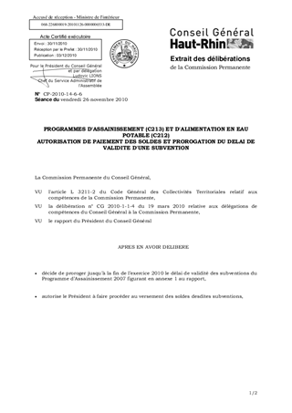 PROGRAMMES D'ASSAINISSEMENT (C213) ET D'ALIMENTATION EN EAU POTABLE (C212) AUTORISATION DE PAIEMENT DES SOLDES ET PROROGATION DU DELAI DE VALIDITE D'UNE SUBVENTION