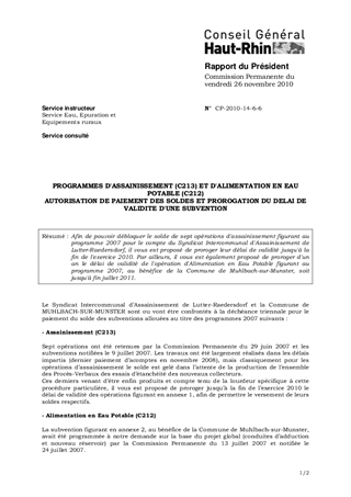 Afin de pouvoir débloquer le solde de sept opérations d'assainissement figurant au programme 2007 pour le compte du Syndicat Intercommunal d'Assainissement de Lutter-Raedersdorf, il vous est proposé de proroger leur délai de validité jusqu'à la fin de l'exercice 2010. Par ailleurs, il vous est également proposé de proroger d'un an le délai de validité de l'opération d'Alimentation en Eau Potable figurant au programme 2007, au bénéfice de la Commune de Muhlbach-sur-Munster, soit jusqu'à fin juillet 2011.