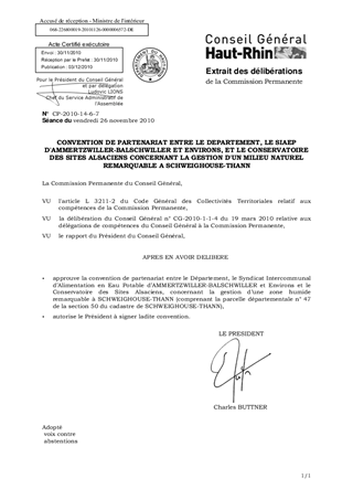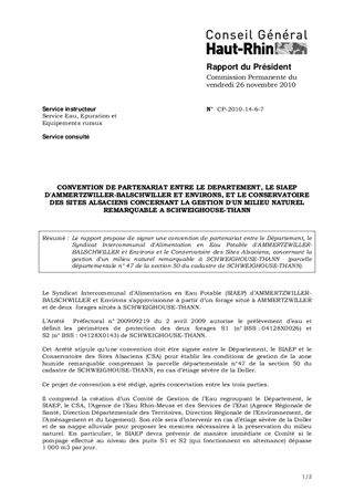 CONVENTION DE PARTENARIAT ENTRE LE DEPARTEMENT, LE SIAEP D'AMMERTZWILLER-BALSCHWILLER ET ENVIRONS, ET LE CONSERVATOIRE DES SITES ALSACIENS CONCERNANT LA GESTION D'UN MILIEU NATUREL REMARQUABLE A SCHWEIGHOUSE-THANN
