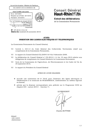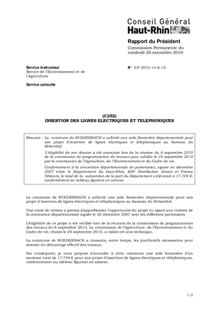 La commune de RUEDERBACH a sollicité une aide financière départementale pour son projet d’insertion de lignes électriques et téléphoniques au hameau du Birkenhof. L’éligibilité de son dossier a été examinée lors de la réunion du 6 septembre 2010 de la commission de programmation de travaux puis validée le 20 septembre 2010 par la commission de l’Agriculture, de l’Environnement et du Cadre de vie. Conformément à la convention départementale de partenariat, signée en décembre 2007 entre le Département du Haut-Rhin, EDF Distribution Alsace et France Télécom, le total de la subvention de la part du Département s’élèverait à 17.704 €, conformément au tableau figurant en annexe.