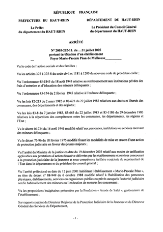 portant tarification d'un établissement Foyer Marie-Pascale Péan de MULHOUSE. Resumé Pièces jointes ARRETE Assemblée : Non défini Date : 21/07/2005 Rapporteur : Non défini Collectivité : Conseil départemental du Haut-Rhin Direction : Non défini Service : Direction de la Solidarité Domaine : Prix de Journée Commission :