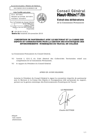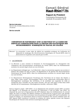 CONVENTION DE PARTENARIAT AVEC LE RECTORAT ET LA CAISSE DES DEPÔTS ET CONSIGNATIONS POUR LA GESTION DES STATISTIQUES DES ENVIRONNEMENTS NUMERIQUES DE TRAVAIL EN COLLÈGE