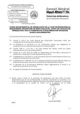 FONDS DEPARTEMENTAL DE PEREQUATION DE LA TAXE PROFESSIONNELLE ********** PRELEVEMENT PRIORITAIRE DE DROIT SOLLICITE, AVANT LES TRAVAUX DE PEREQUATION, PAR LA COMMUNAUTE D’AGGLOMERATION MULHOUSE ALSACE AGGLOMERATION